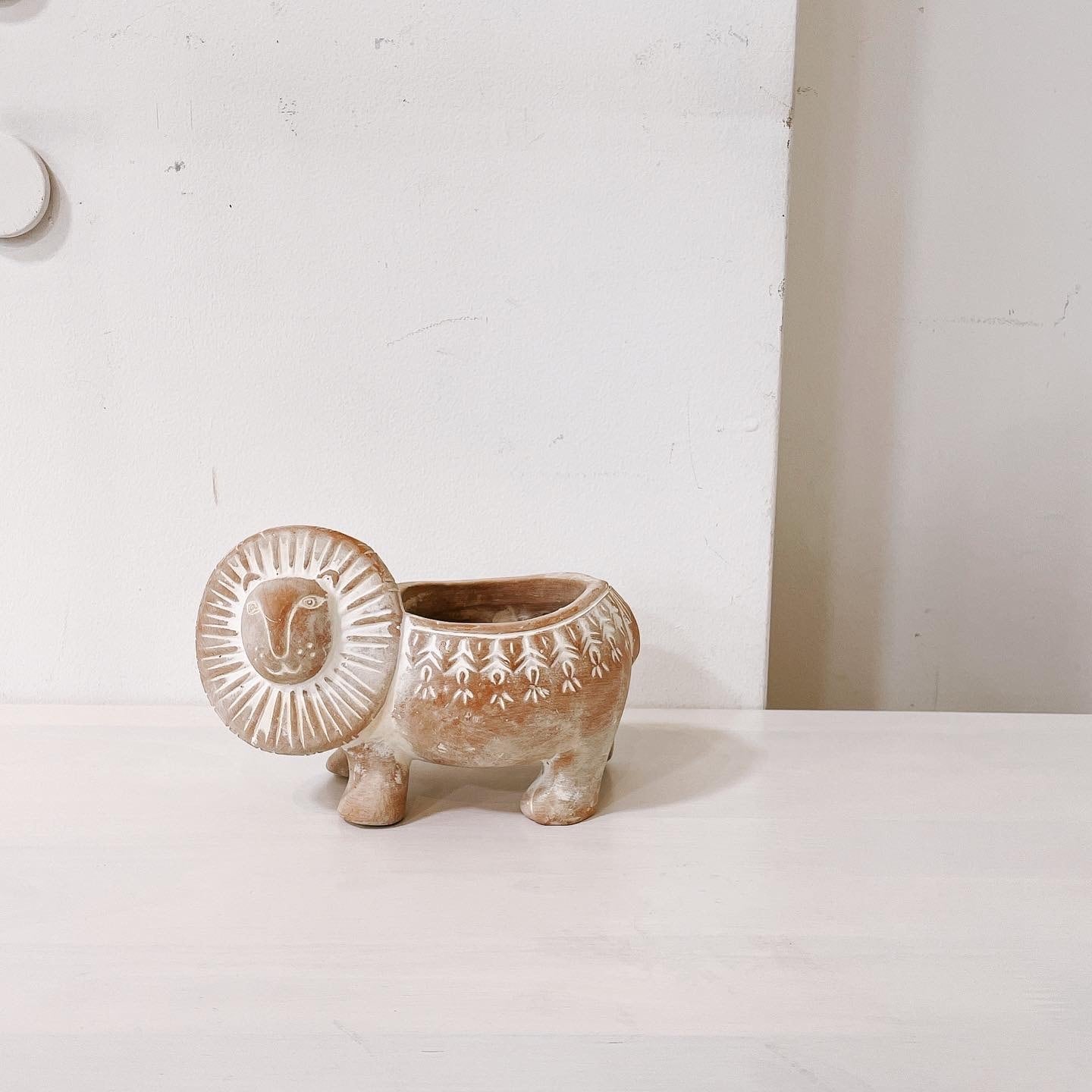 ライオンをかたどったプランター。たてがみが丸く可愛らしいライオン。朝夕と話しかけたくなりますね。