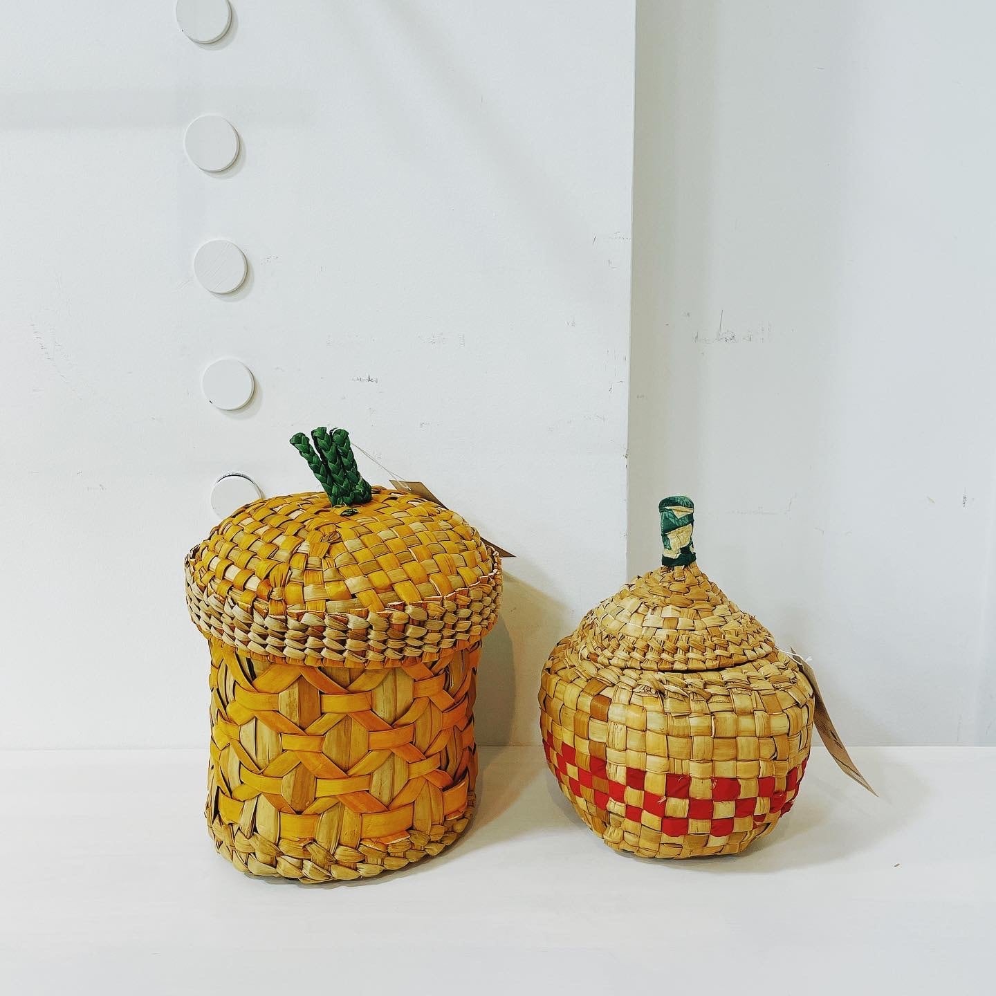 パイナップルをイメージしあ手編みのバスケット。葉っぱの持ち手がある蓋付き。お部屋などの小物などをしまって隠せるのもポイント。可愛らしいカゴがお部屋を飾ります。
