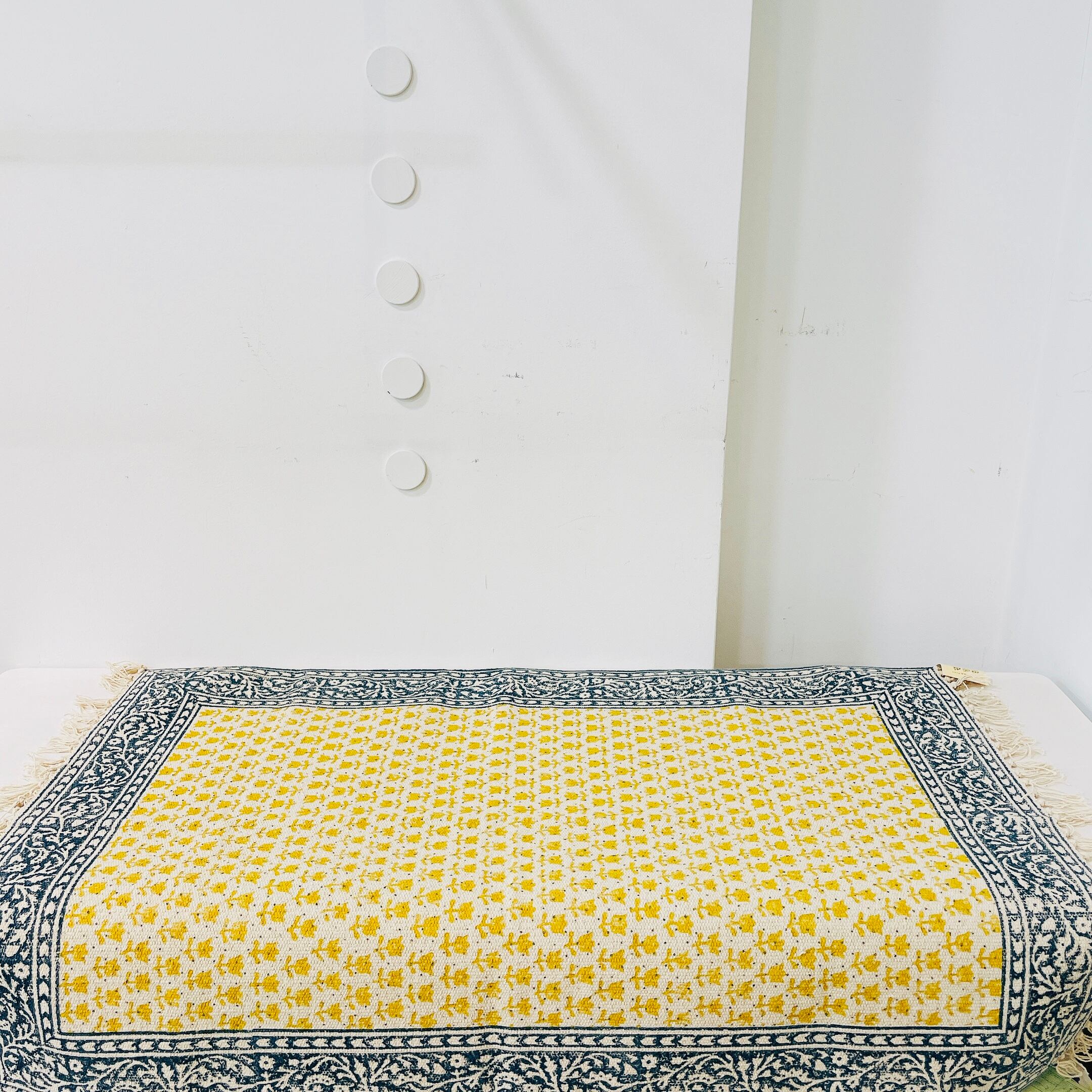 手織りのやわらかなコットンラグに、ブロックプリントで細かいフラワー柄をあしらいました。大サイズは小さめのソファやテーブルなどの下に。